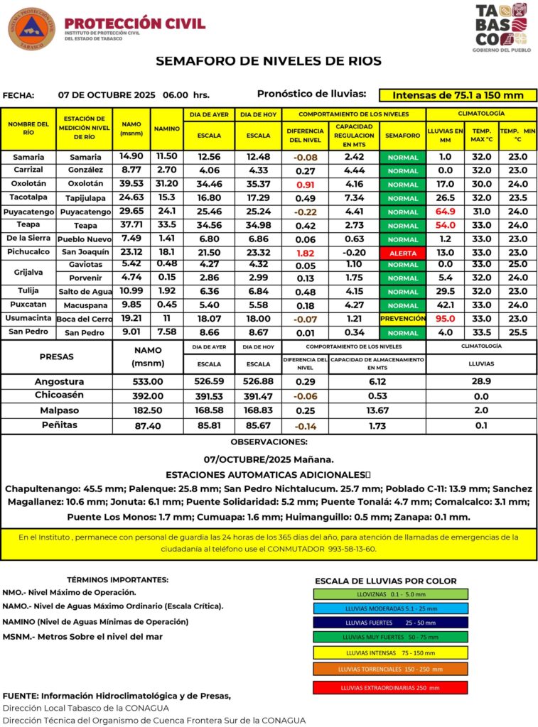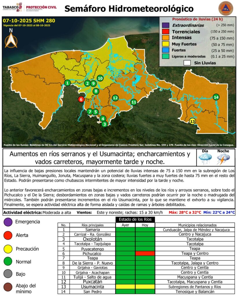 Lo anterior favorecerá encharcamientos en zonas bajas e incrementos en los niveles de los ríos y arroyos serranos, sobre todo el Pichucalco y el De la Sierra; desbordamientos en zonas bajas y vados carreteros podrían ocurrir por la noche o madrugada del miércoles.
