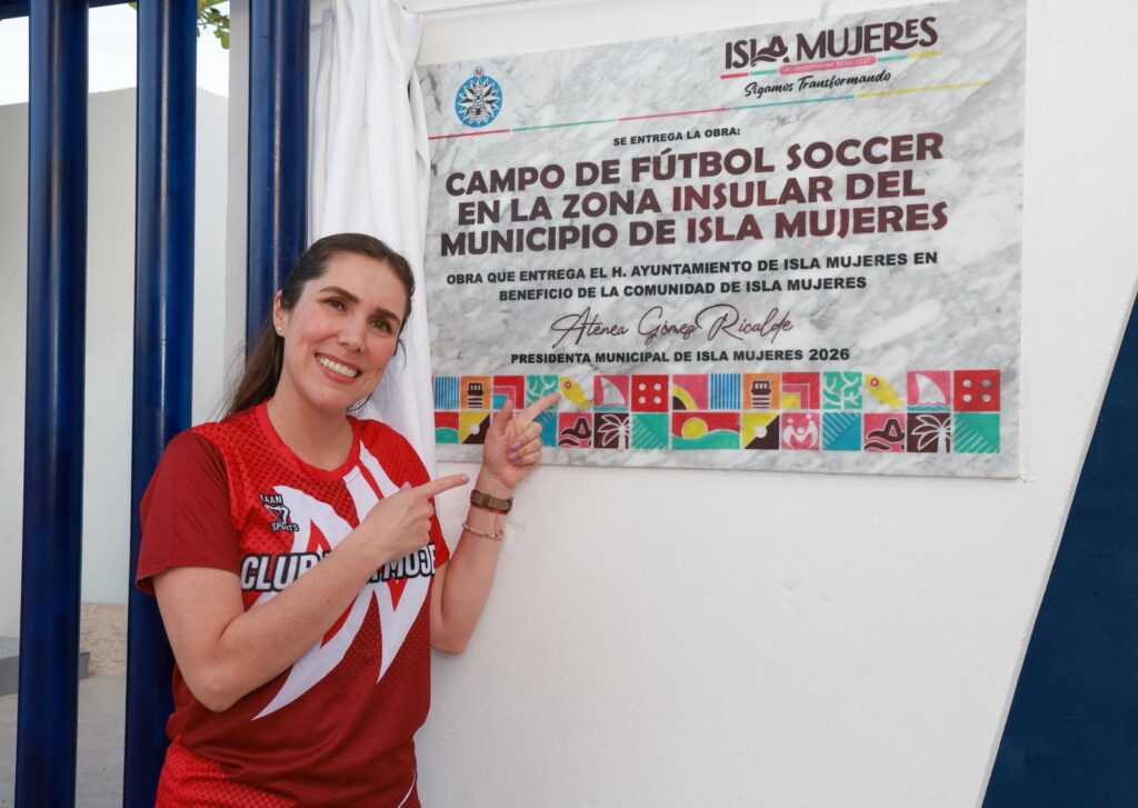 Isla Mujeres, Quintana Roo, 21 de abril de 2026.- La Presidenta Municipal, Atenea Gómez Ricalde, inauguró la nueva cancha de fútbol soccer en la colonia Salinas, reafirmando su compromiso de seguir transformando Isla Mujeres con obras que elevan la calidad de vida de las familias y fortalecen el desarrollo de la niñez y juventud, a través del deporte.