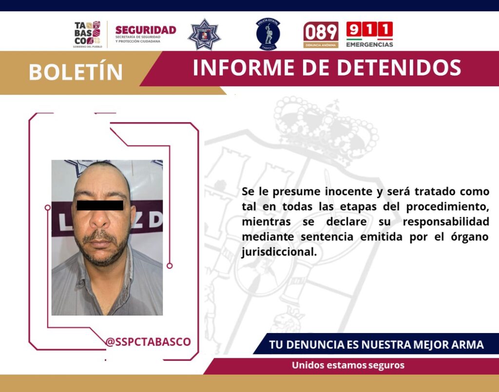 Como parte de la Estrategia Antiextorsión y del Plan de Contención del Delito implementado por las instituciones que integran la Fuerza Interinstitucional de Reacción Táctica (FIRT) Olmeca, en estrecha coordinación con la Secretaría de Seguridad y Protección Ciudadana (SSPC), se logró la detención de un masculino presuntamente originario de Medellín, Colombia, en la calle Revolución de la colonia Tamulté de las Barrancas, del municipio de Centro.