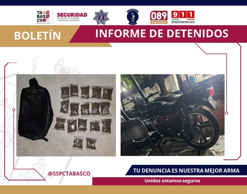 Durante la intervención operativa se realizó el decomiso de: bolsitas transparentes que en su interior contenían hierba verde seca con características similares a la marihuana, una bolsa tipo neceser de color negro con la leyenda CAAG, una motocicleta marca Italika FT150, color negro, con placas del estado de Tabasco.