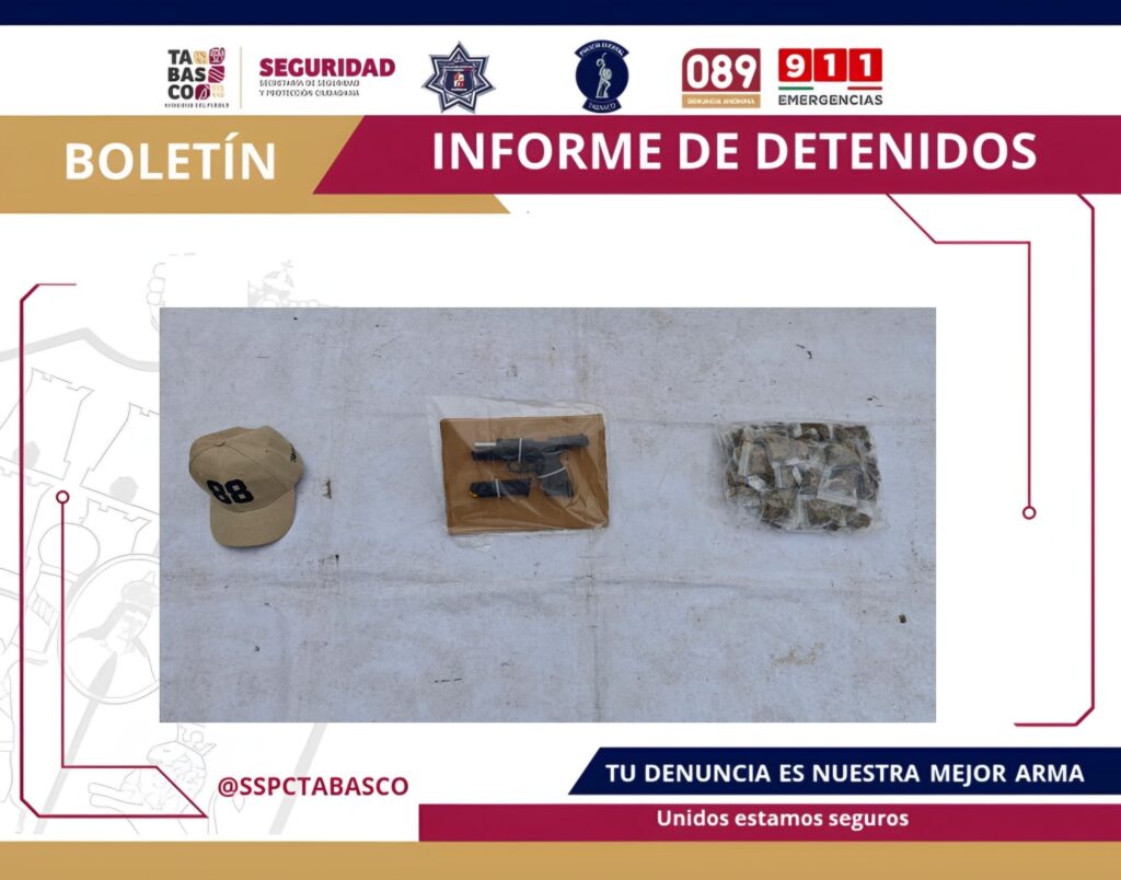 Derivado de recorridos de seguridad, en Plaza Bicentenario ubicada en la carretera Villahermosa – Teapa, se logró el aseguramiento de un masculino de nombre Leo “N” de 28 años, a quien se le aseguraron armas cortas, cargadores, cartuchos útiles, gorras con la leyenda “88” y bolsitas que en su interior contenían hoja seca de color verde con características similares a la marihuana.