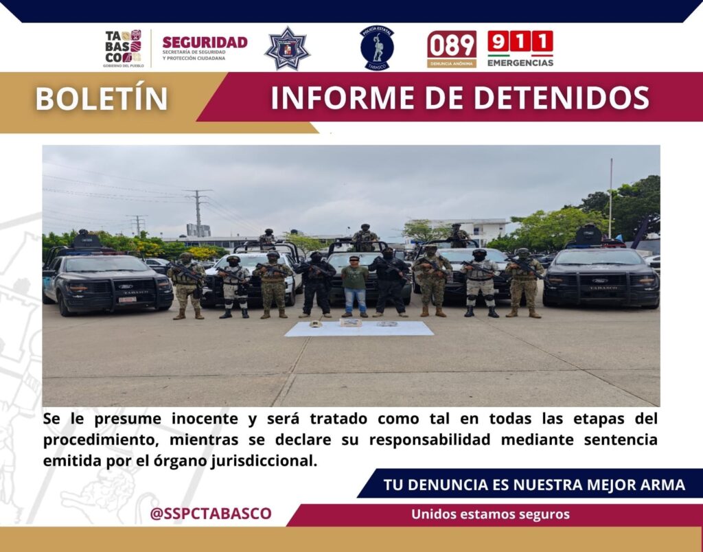 En el marco de la Estrategia Nacional Antiextorsión y del Plan de Contención que implementa la Secretaría de Seguridad y Protección Ciudadana (SSPC) en coordinación con la Fuerza Interinstitucional de Reacción Táctica (FIRT) Olmeca, llevaron a cabo la detención de un masculino por delitos contra la salud en su modalidad de narcomenudeo y portación de arma de fuego.