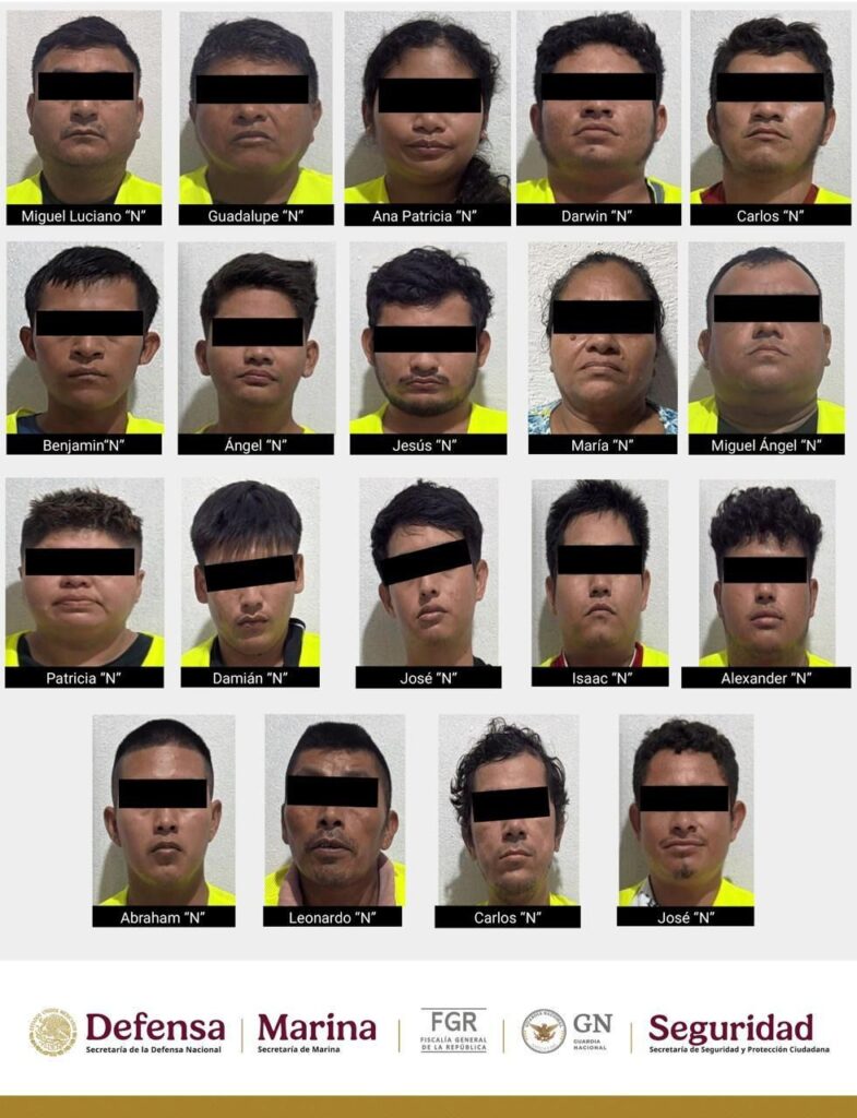 Derivado de trabajos de inteligencia e investigación, en Jalapa, Tabasco, elementos de la Secretaría de Seguridad y Protección Ciudadana (SSPC), Secretaría de la Defensa Nacional (Defensa), Secretaría de Marina (Semar), Fiscalía General de la República (FGR), Guardia Nacional (GN) y la Fiscalía General del Estado (FGE) detuvieron a Jorge Armando “N”, identificado como jefe de plaza de una célula delictiva, junto a 19 personas más, a quienes se les aseguró armamento, vehículos y diversas dosis de droga.