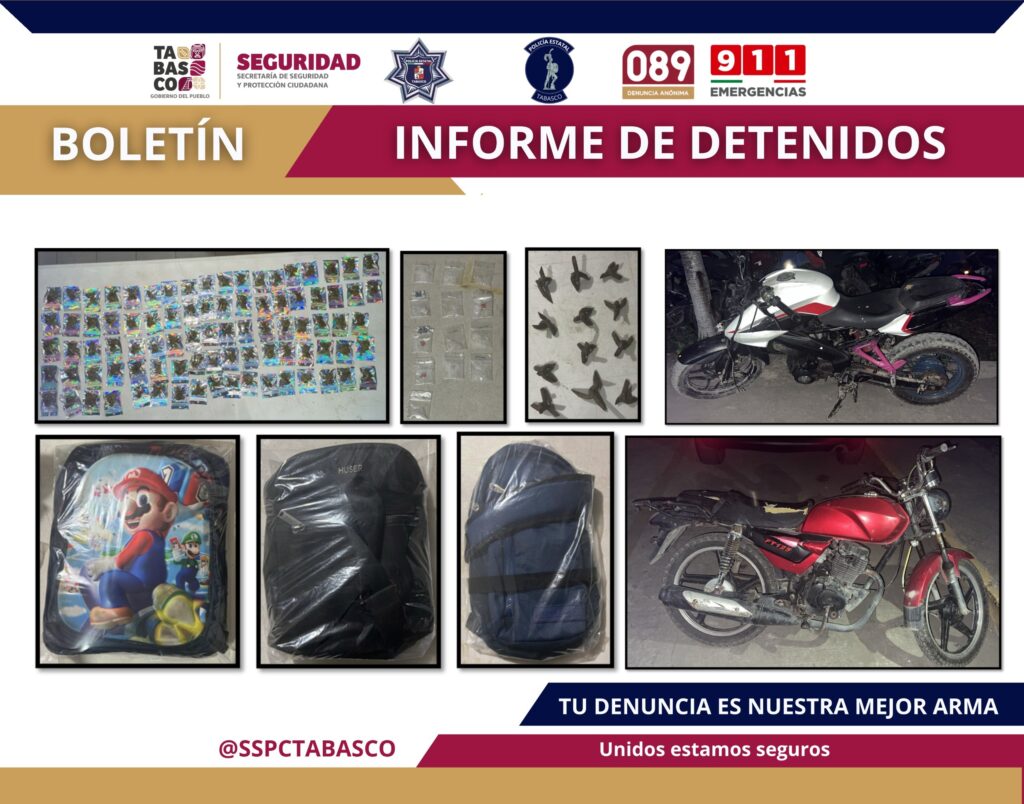 En recorridos de seguridad y vigilancia, la Secretaría de Seguridad y Protección Ciudadana en coordinación con la Fuerza Interinstitucional de Reacción Táctica (FIRT) Olmeca detuvieron a dos masculinos y una femenina como presuntos responsables por el delito contra la Ley General de Salud.