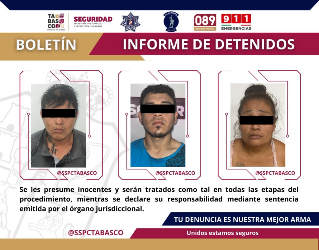 Los hechos ocurrieron sobre calle principal La Selva, Nacajuca, donde detuvieron a Misael Julián “N” de 29 años, José Armando “N” de 20 años (a) “Chepe” y María De los Santos “N” de 38 años (a) “Mari”.