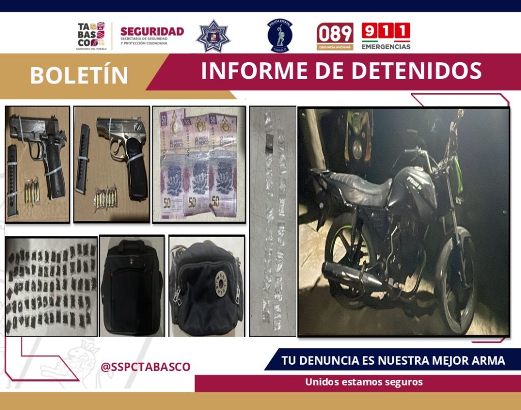 La Secretaría de Seguridad y Protección Ciudadana (SSPC), en coordinación con la Fuerza Interinstitucional de Reacción Táctica (FIRT) Olmeca, llevó a cabo la detención de dos masculinos por su probable responsabilidad en delitos contra la Ley General de Salud y posesión de armas de fuego de uso exclusivo del Ejército Mexicano, sobre la Avenida Periférico, en la colonia Centro del municipio de Huimanguillo.