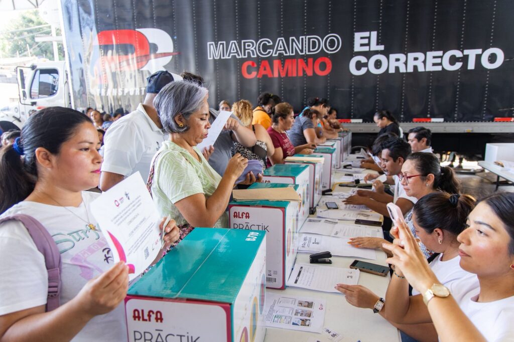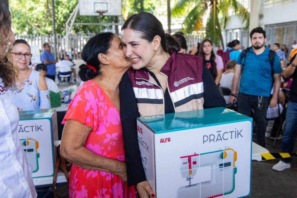 Playa del Carmen.— La presidenta municipal Estefanía Mercado visitó este miércoles el módulo instalado por la Secretaría del Bienestar (Sebien) para supervisar la entrega de máquinas de coser de la Fábrica de Artes y Oficios (Faro), paquetes alimentarios del programa “Comemos Todos” y afiliación al programa “Salud Sin Tanto Choro”, una iniciativaque acerca atención médica directa, rápida y sin trámites complicados a las familias playenses.