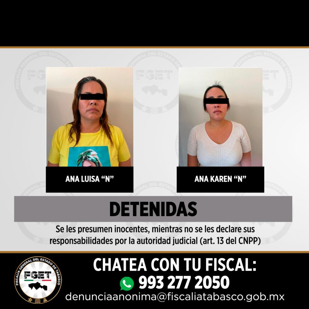 La intervención se centró en cinco predios ubicados en un camino rural hacia Jalapa. En el lugar, elementos de seguridad cumplimentaron la orden derivada de una carpeta de investigación, logrando la detención de Ana Luisa “N”, de 47 años de edad y Ana Karen “N”, de 27.
