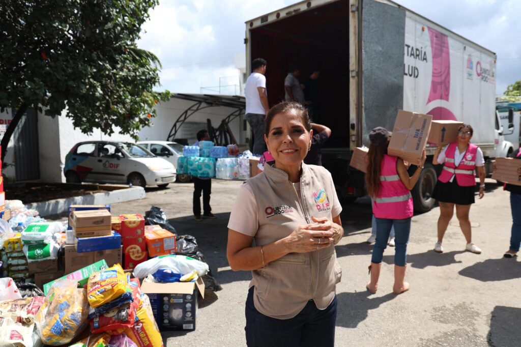 En paralelo, la Gobernadora indicó que los trabajos se realizan de manera simultánea en distintos puntos del estado: mientras su equipo opera desde Chetumal, su hermana Vero coordina las acciones en Cancún. “Gracias al apoyo de la gente, gracias al enorme corazón que tenemos en esta patria hermosa, se están enviando los camiones y se siguen llenando más”, agregó.