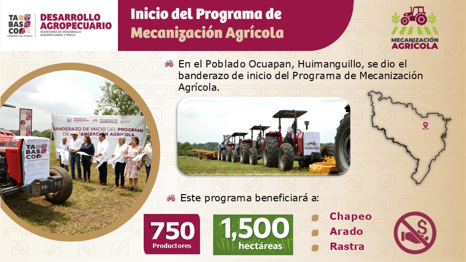 Con respecto al programa de mecanización agrícola, el servidor público de la Secretaría de Desarrollo Agropecuario y Pesca (SEDAP) mencionó que ya inició en Huimanguillo, en beneficio de más de 750 productores en mil 500 hectáreas.