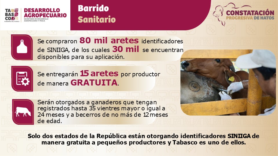 De la misma manera, resaltó que esta semana iniciará la entrega de aretes SINIIGA de manera gratuita, que serán otorgados con el avance del barrido sanitario en la primera etapa en La Chontalpa, en el municipio de Huimanguillo. Destacó que, gracias al apoyo del mandatario, Tabasco es uno de los dos estados del país que apoya a los pequeños productores.